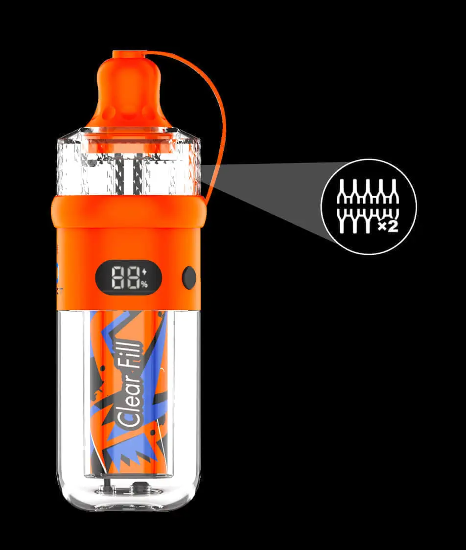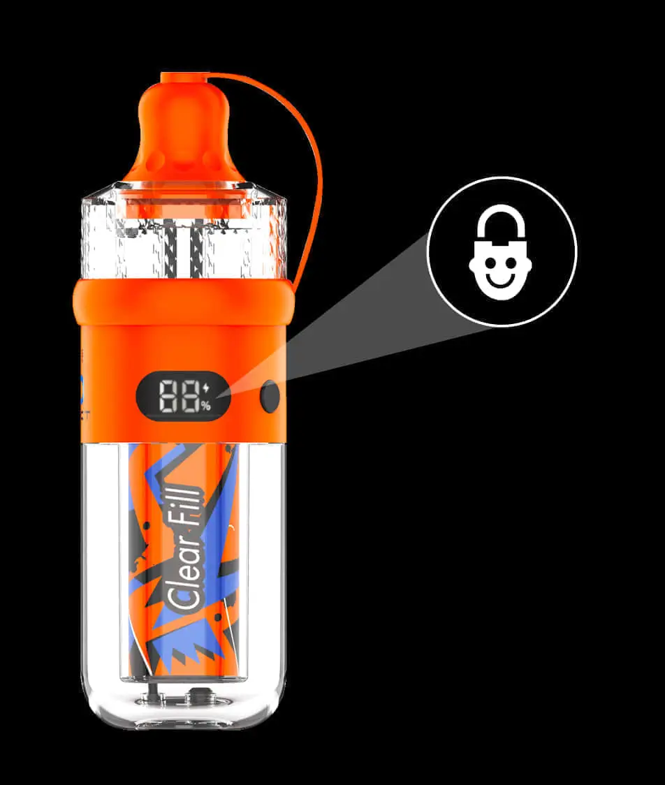 The Clear Fill can be used up to 40,000 puffs, making it durable. With a built-in 850mAh battery, it provides reliable support for the stable operation of the device. The equipped display screen can show the battery level in real time, enabling users to keep track of the device’s status. The child safety lock function further enhances the safety of use, preventing children from accidental touch. Its appearance, resembling a sports water bottle, is not only stylish and personalized but also easy to carry. Whether for daily travel or outdoor sports, it can easily meet users’ vaping needs.