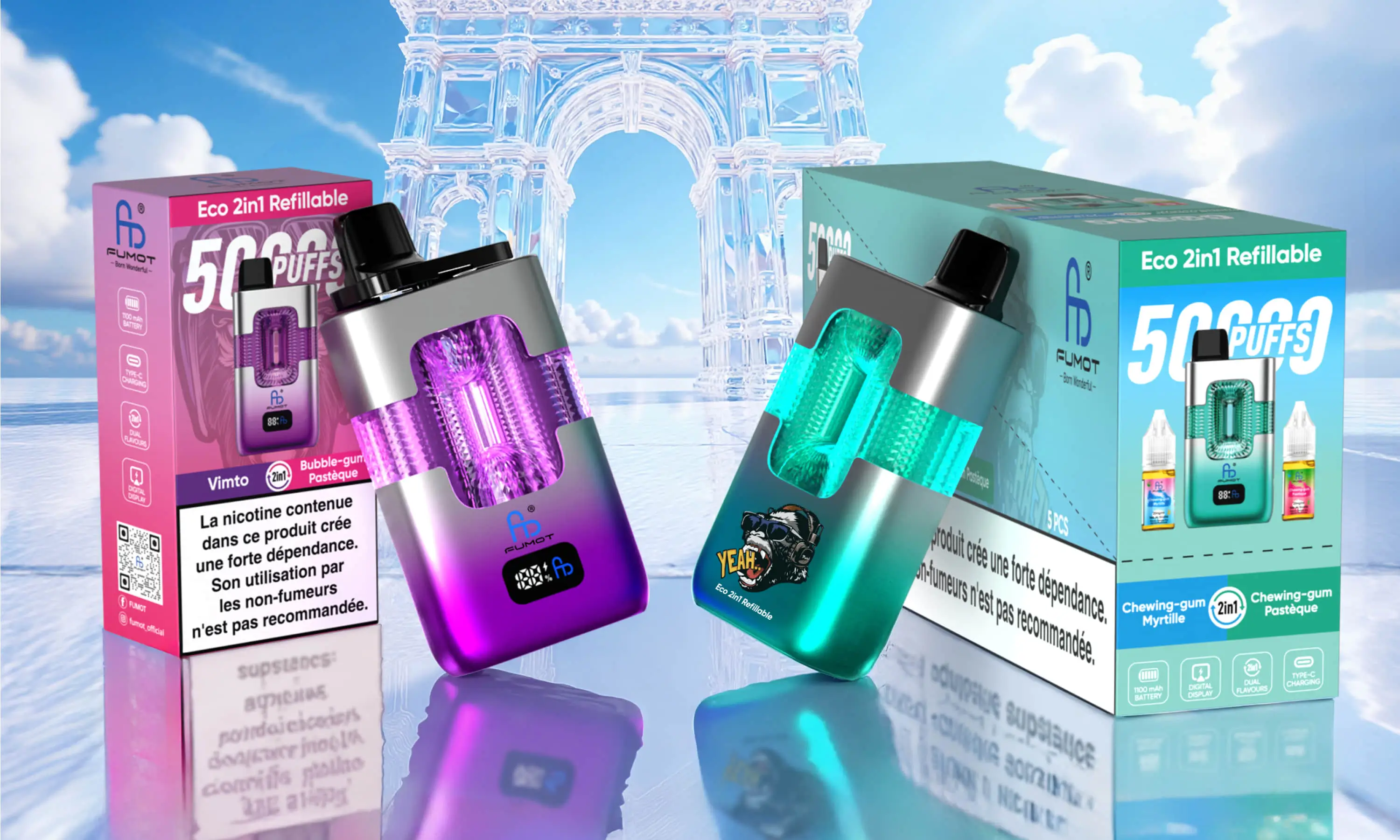 The ECO 2in1 Refillable is a refillable pod system featuring “dual separate oil compartments”, with the core design highlight of supporting simultaneous refilling of two different e-liquids (10ml per compartment) for a dual-flavor experience. It is equipped with a 0.9Ω mesh coil to ensure full atomization of e-liquids; a built-in 1100mAh battery paired with a Type-C charging port for efficient battery life and recharging; a smart display for clear device status monitoring; and an appearance with iridescent lighting + transparent oil compartments, combining a sense of technology and visual recognition.